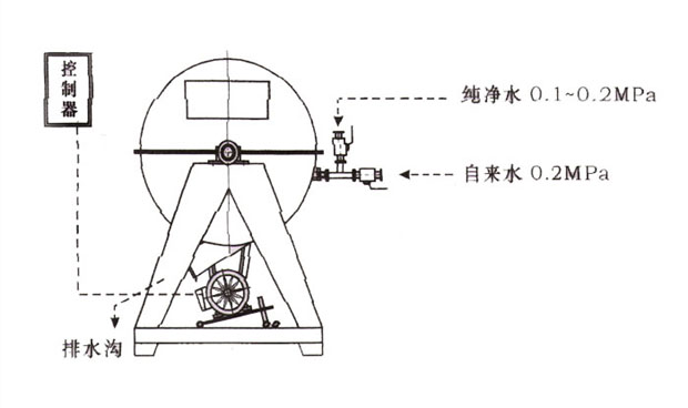 工作原理:将瓶连盘装入该机的旋转架上,打开进水阀门,启动电机,变频器将自动控制电机慢速运行进行清洗,冲洗约60秒(可调)后自动高速运行,将瓶中的水及杂质甩出,达到清洗甩干的目的。
